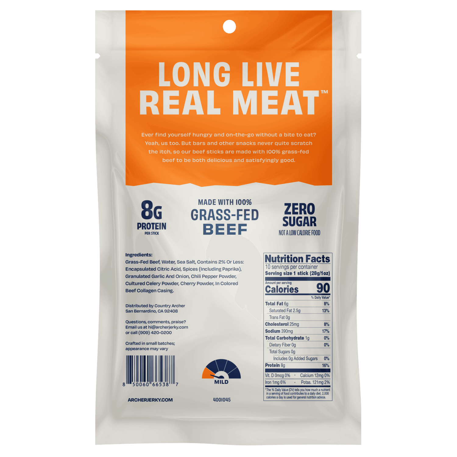 Grass-Fed Beef, Water, Sea Salt, Contains 2% Or Less: Encapsulated Citric Acid, Spices (Including Paprika), Granulated Garlic And Onion, Chili Pepper Powder, Cultured Celery Powder, Cherry Powder, In Colored Beef Collagen Casing.