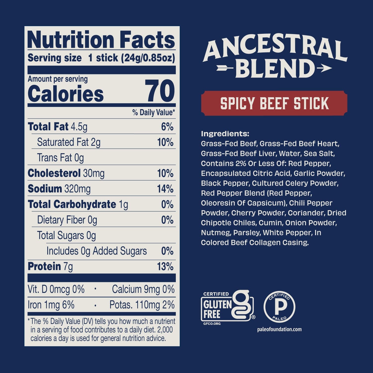 Grass-Fed Beef, Grass-Fed Beef Hear, Grass-Fed Beef Liver, Contains 2% Or Less: Water, Sea Salt, Red Pepper, Encapsulated Citric Acid, Cultured Celery Powder (Celery Powder, Sea Salt), Garlic Powder, Black Pepper, Red Pepper Blend (Red Pepper, Oleoresin Of Capsicum), Chili Pepper Powder, Cherry Powder, Coriander, Dried Chipotle Chiles, Cumin, Onion Powder, Nutmeg, Parsley, White Pepper, In Colored Beef Collagen Casing.